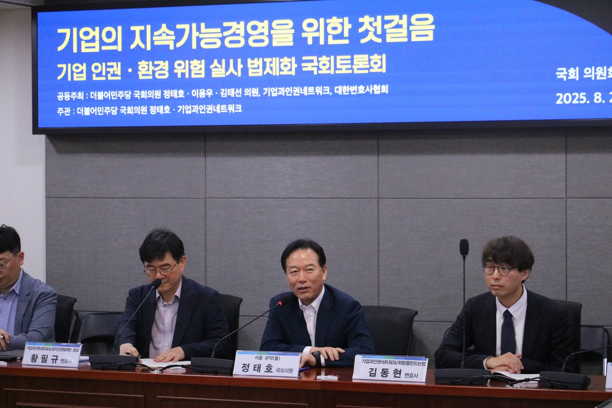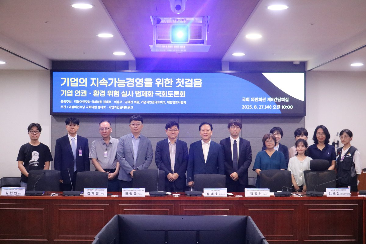 KTNC Watch, together with Democratic Party lawmakers Chung Tae-ho, Lee Yong-woo, and Kim Tae-sun, and the Korean Bar Association, held a National Assembly discussion titled ‘First Step Toward Corporate Sustainable Management - Legislation for Corporate Human Rights and Environmental Risk Due Diligence’ in Room 8 of the National Assembly Members' Office Building on 27 August 2025. The forum featured discussions on the necessity of legislating sustainable corporate management through human rights and environmental protection, along with specific deliberations on the “Act on the Protection of Human Rights and the Environment for Sustainable Business Activities (abbreviated as the Supply Chain Due Diligence Act),” proposed last June.